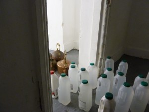 Close door. Sweep floor. Sit on floor. Look around. A loitering group of plastic milk bottles peer curiously around a wall. Put some of my copper pots by them. Are they inviting the plastic bottles out or herding them back in? This space is small and quiet, with even smaller, quieter spaces leading off it,…