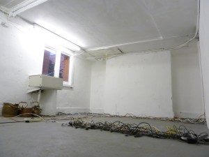 Wires, cables, switches, plumbing encircle the top of the space- out of reach of floodwater which might have visited this subterranean space in the past. Exposed but whitewashed. Disappearing and reappearing at will through the ceiling, walls and window frame. How many people would be effected by the cutting of a single one, or how many of these cable and pipes are empty, old, obsolete?