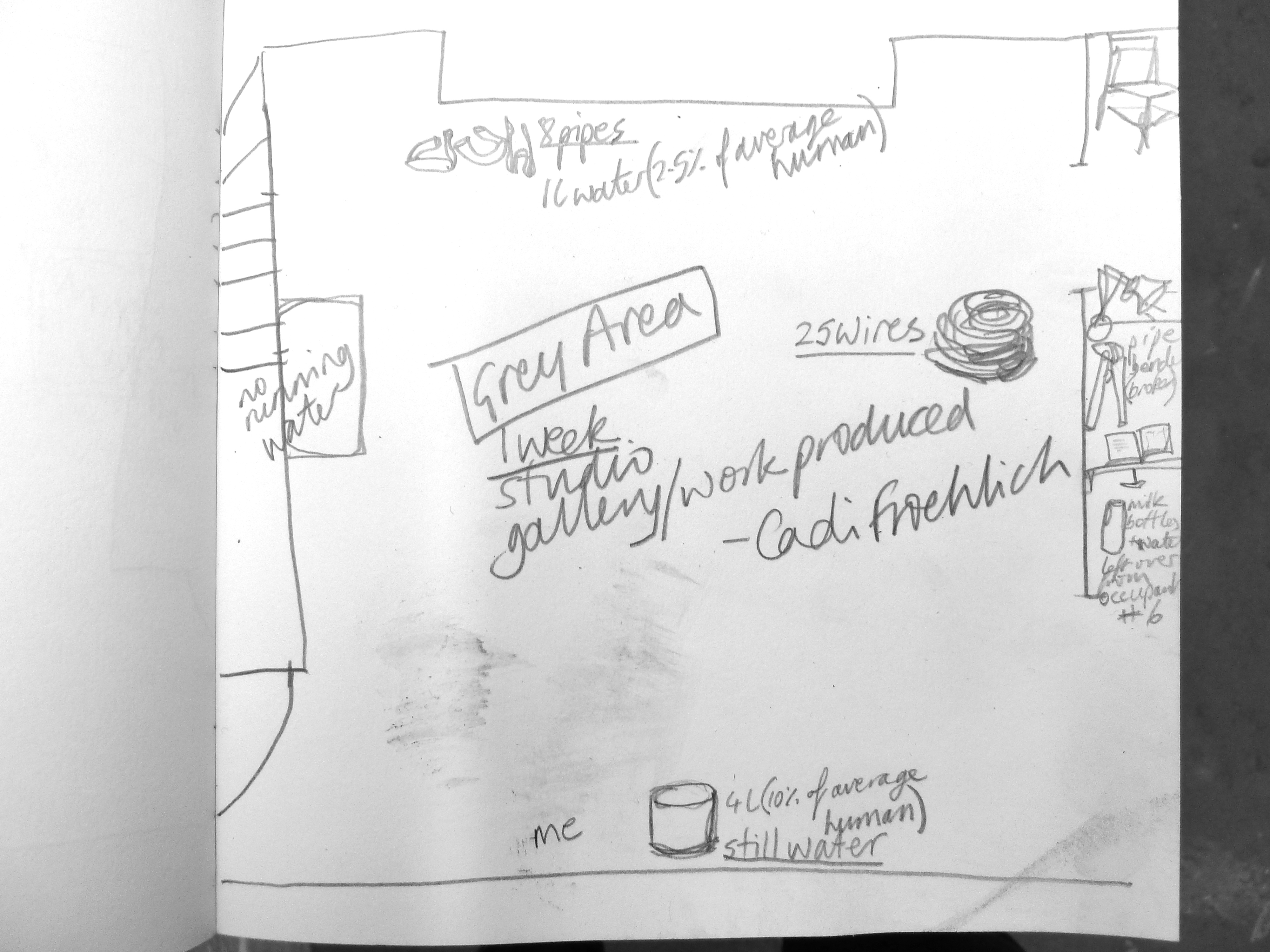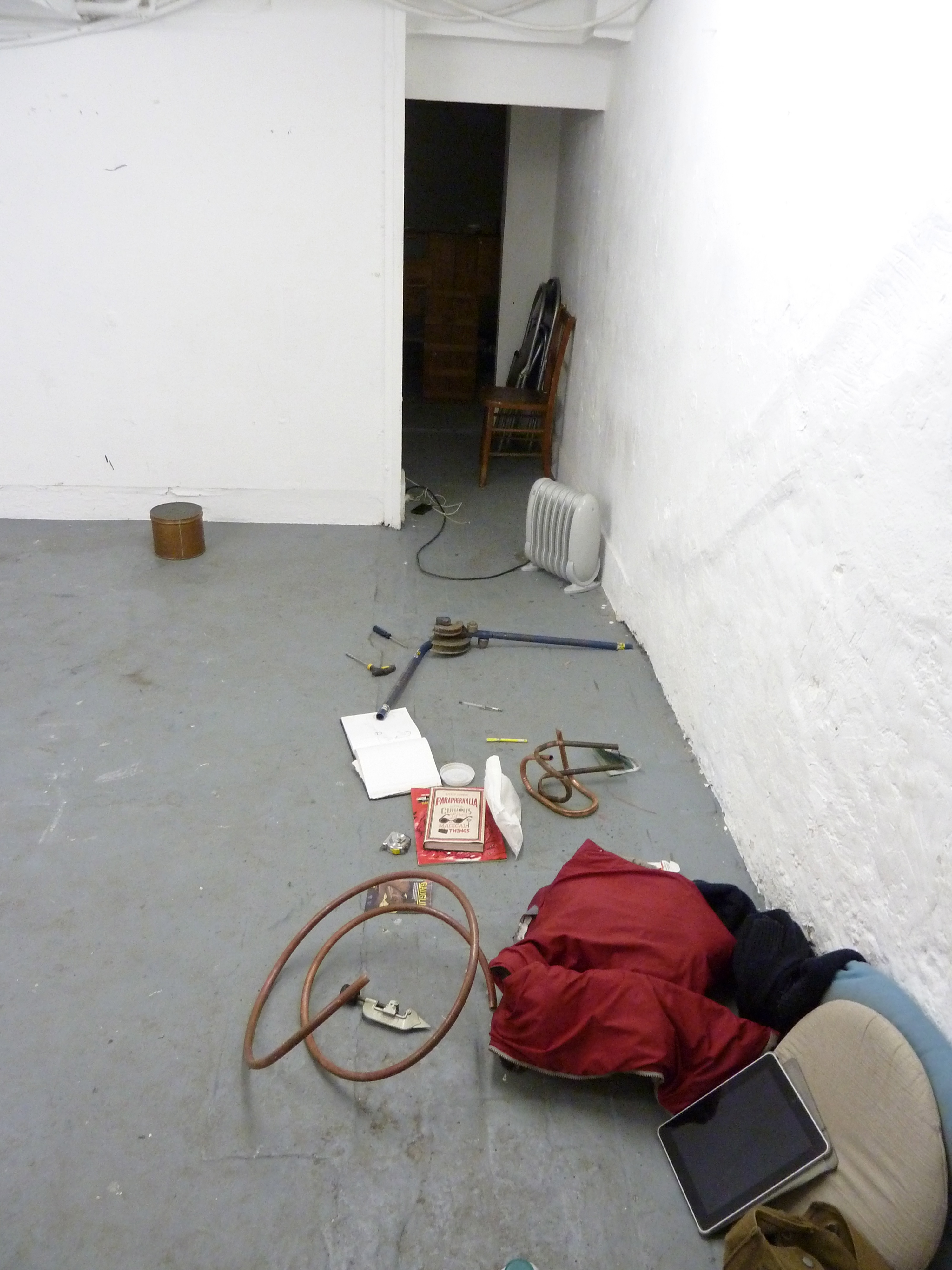 Clearing up the space, placing the pipes where I want them, I couldn’t bring myself to remove the ‘person’ represented by the pot of water (which I see as myself after my week of residency), so it finds its space there after all.