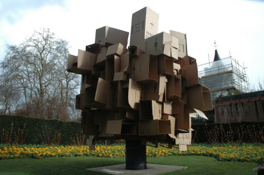 In the 2006 work Sajida Talfah in Holland park, Hudson was addressing issues of tyrany, politics and human suffering. It consists of an enthusiastically wrapped, packed and taped up structure atop a plinth formally occupied by a monument to Napoleon in a park founded by Lord Holland who supported him, and is named after a wife of Saddam Hussein. The structure evolved over the year to echo the seasons. It’s elevated position and ferocity of construction appeared to be overpowering. The ugly truth of of global political allegiances and oppression seemed represented by the impression that something was being confined or protected within all the tape. The spring incarnation featured an explosion of cardboard boxes, gaping open at us.