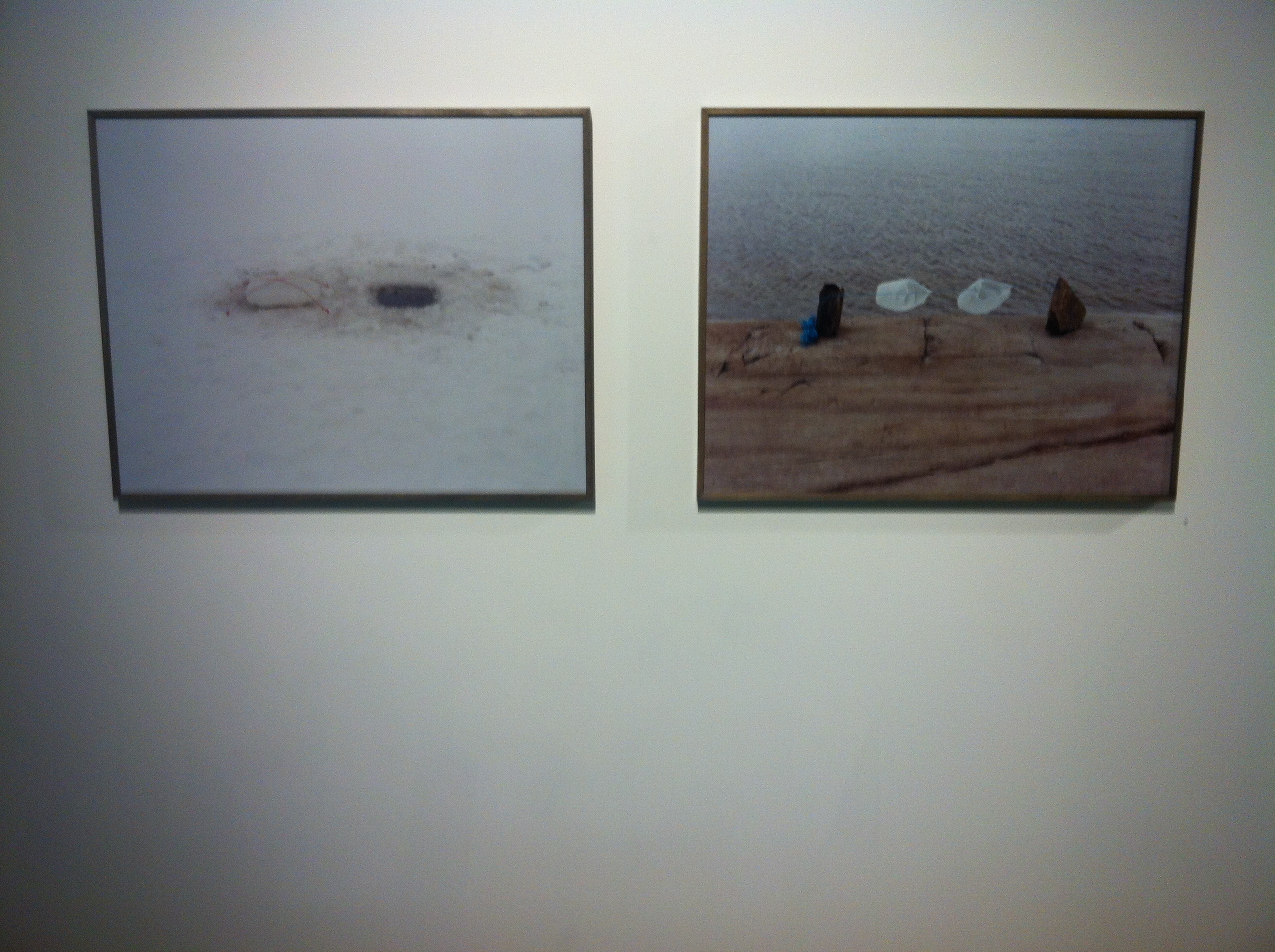 Her subtle interventions at the sites she photographs add another dimension to her statement for me. I imagine the volumes depicted by the ‘lumps’ of material in the photos to be roughly equal, yet the solid ice is further tied down, and the bags of air appear to flutter on a string, accenting their physical qualities.