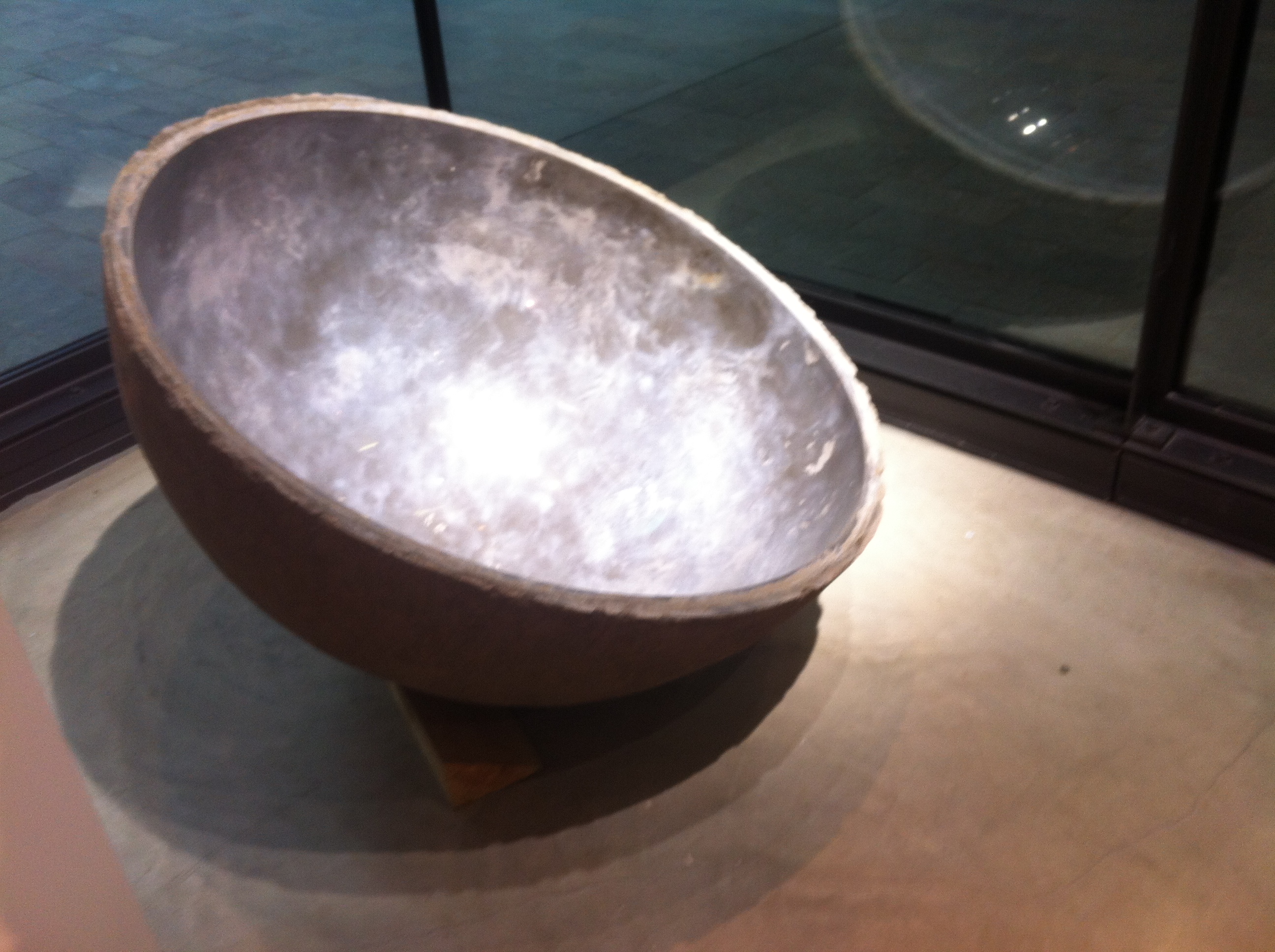 Lastly, this collaboration, “…this depicts you as you should be, and not as you are…” Barthes, really stood out for me, though it provoked much discussion in the bar later. It was placed open to the gallery windows, exposing the smooth inside, like half an egg, or a tennis ball. The outside showed more visible, rougher signs of making, but the craftmanship was visible throughout. It was the writing accompanying it which caused most furore: ‘This work comments on society’s transformation to a pure state of communication, the distance between identity and environment, emphasising this dialectic void and sense of self’. Worryingly I think, this makes perfect sense to me, and I think that as it was made as a collaboration only reinforces what the artists intend to convey. I think of the curve as the shortest distance around a central point. I see the inside as an intimate sharing, the outside rough but more durable. I see the desire to touch (even though it would be discouraged, esp in gallery) and I see all this expressed in materials manipulated industrially, whethere they are natural or not. Possibly the last phrase is a bit Barthes-heavy, but I sometimes wish I could reference current writing like this in my own work…
