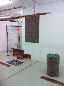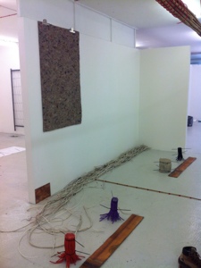 The incarnations so far have by degrees followed the layout of the electric wires and living visible above the space, which has actually seemed to flatten the work out. Nothing was moving. Today the prospect of moving spaces has opened things up a bit which is actually really interesting. I have started playing with materials and clumps again.