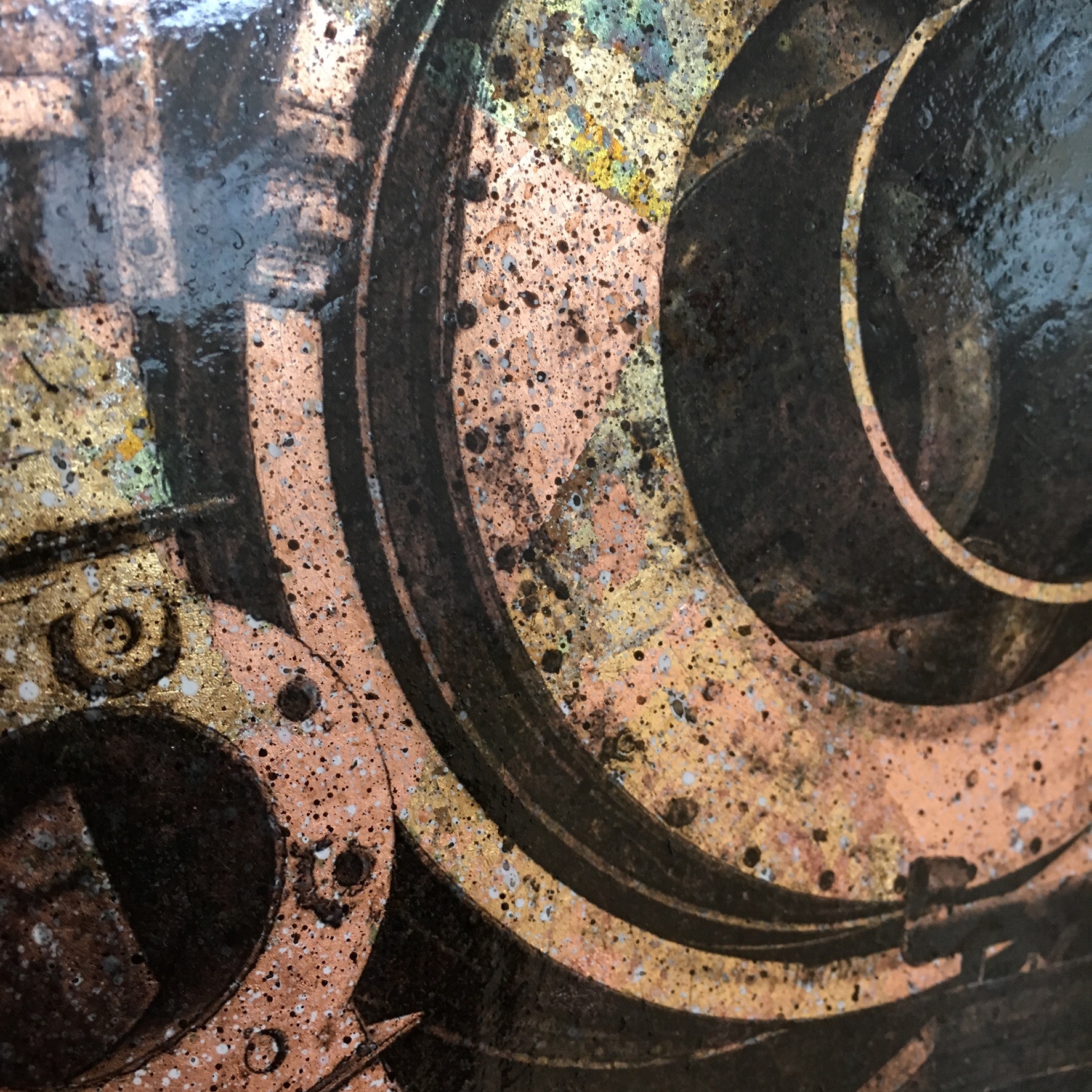 Darren Nisbett is showing a photographic series chronicling his exploration of abandoned and derelict industrial machinery. They are printed on guilted and textured metal, which transforms them into becoming relics themselves. They might be as decayed as their subjects.